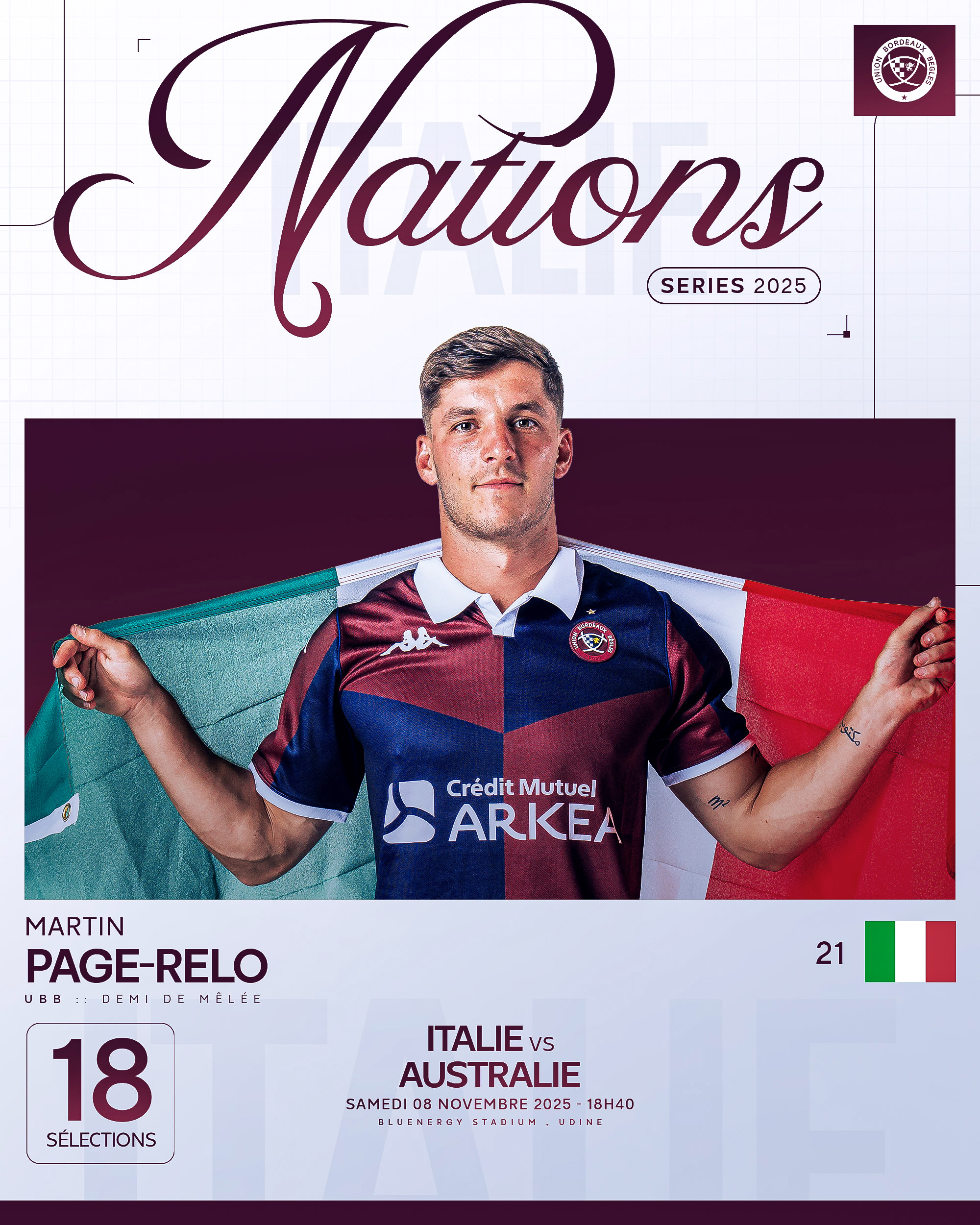 Déjà capé à 18 reprises avec la Squadra Azzurra, notre numéro 9 Martin Page-Relo commencera sur le banc pour ce premier test de la Tournée de Novembre. Les italiens affronteront l'Australie à Udine ce samedi à 18h40.