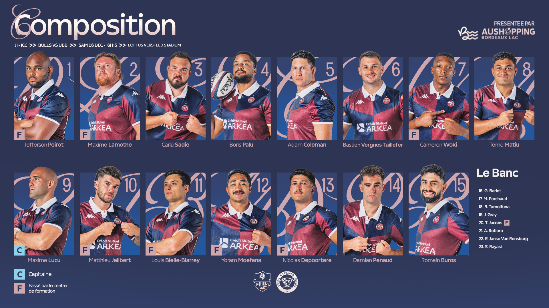 Début de cette saison 2025-2026 de Champions Cup par un déplacement chez les Vodacom Bulls ! Nos Girondins affronteront les Sud-Africains demain à 16h15 à Pretoria. Voici la composition d'équipe :