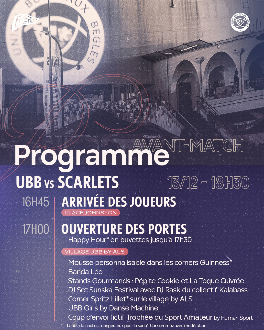 Le bus de l'UBB déposera les joueurs Place Johnston autour de 16h45, pour qu'ils parcourent les derniers mètres au plus proche de vous, avec speaker et DJ à partir de 16h30. Venez partager ce moment privilégié !