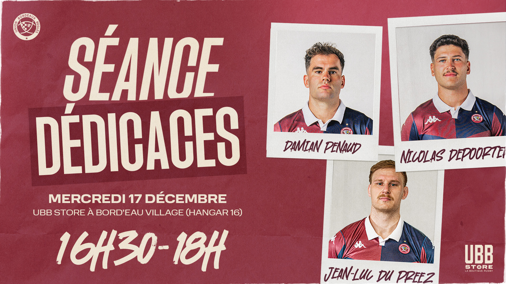 Ce mercredi 17 décembre retrouvez Nicolas Depoortere, Damian Penaud et Jean-Luc Du Preez dans notre boutique de l'UBB Store pour une séance de dédicaces de 16h30 à 18h.