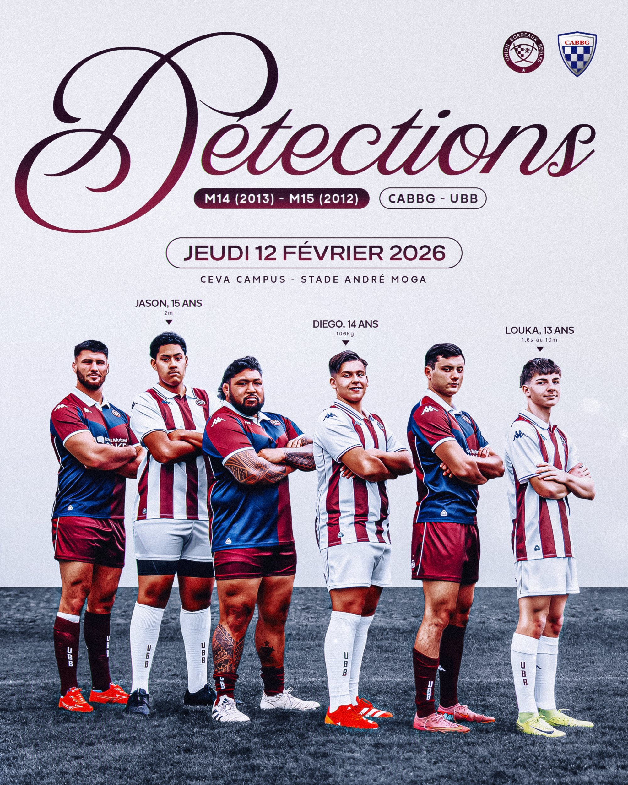 Cette année encore, le CABBG organise en collaboration avec l'UBB une journée de détection destinée aux jeunes garçons souhaitant intégrer la filière jeune du club. Pour la saison prochaine, cette journée se déroulera le 12 février 2026 au CEVA-Campus - Stade Moga.