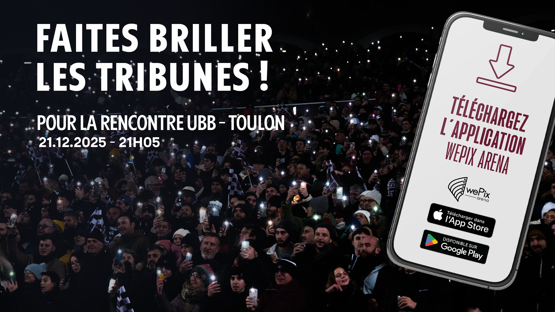Téléchargez l'application WePix Arena : grâce à vos mobiles, et participez au spectacle lumineux au signal de votre speaker avant le coup d'envoi du match face à Toulon.