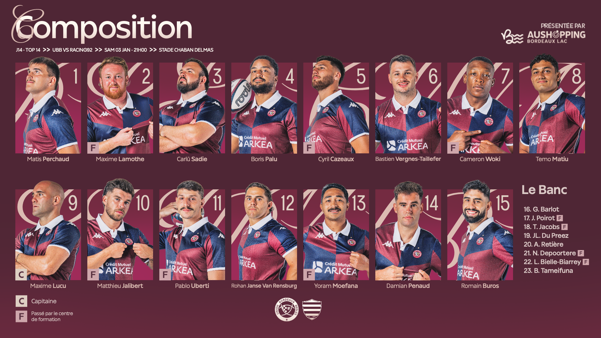 Première rencontre de l’année 2026 ce week-end à Chaban, avec la réception du Racing 92 samedi 3 janvier à 21h. Découvrez la composition de l’équipe :