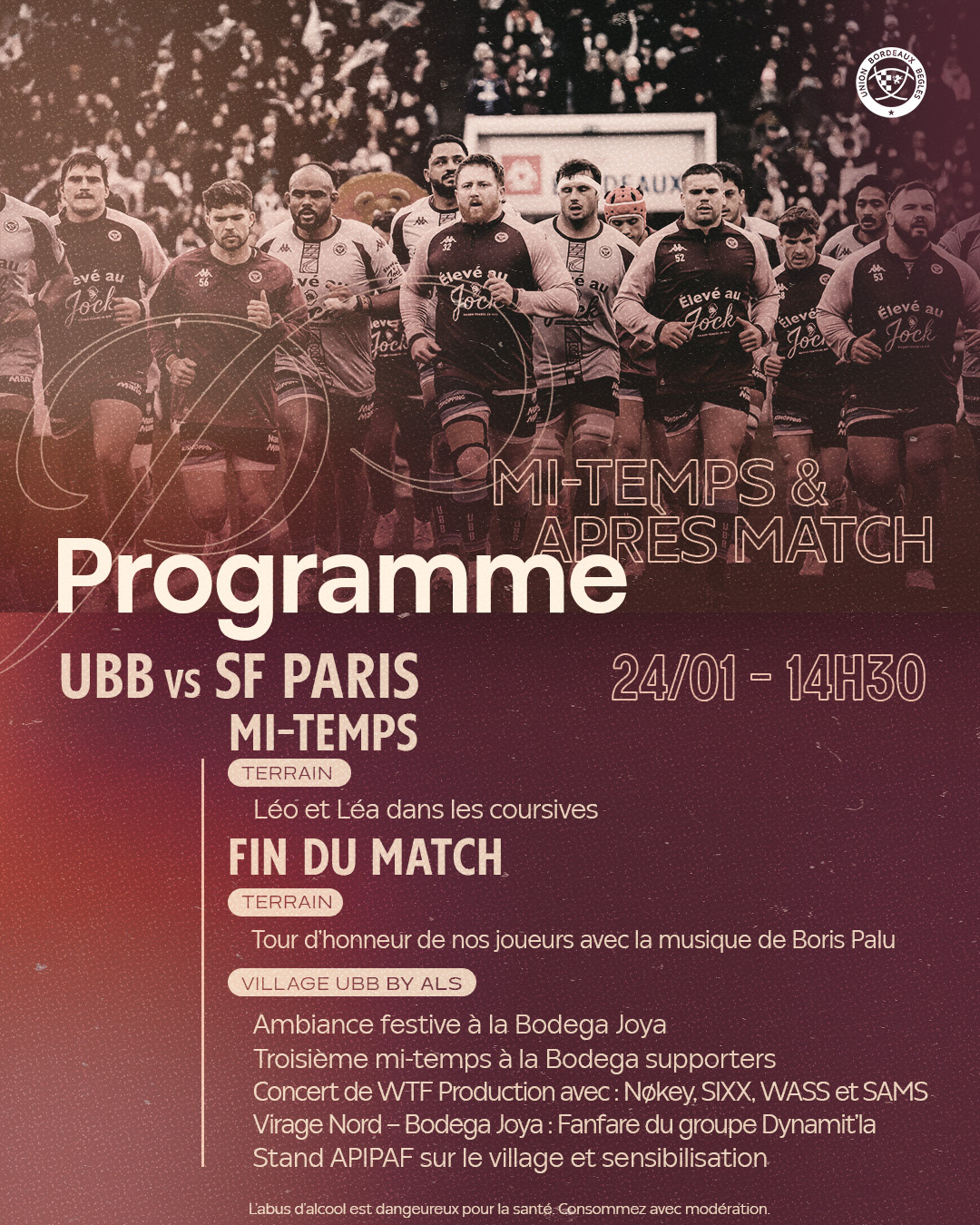 Pour cette 15e journée de TOP 14, l'UBB reçoit le Stade Français ce samedi à 14h30 au stade Chaban-Delmas. Avant-match, buvettes, boutiques... retrouvez toutes les infos à connaître sur la rencontre dans notre article :