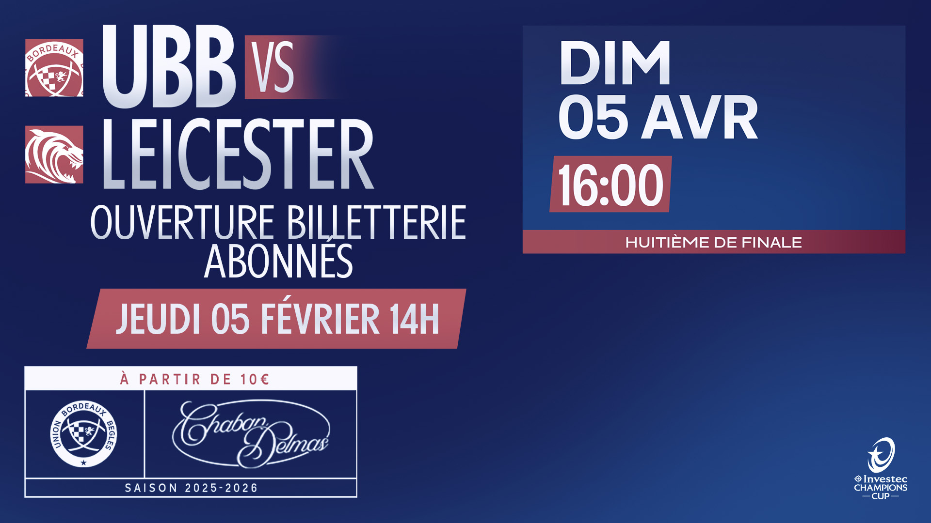 Dimanche 6 avril à 16h00 l'UBB recevra Leicester à Chaban en 1/8e de finale d'Investec Champions Cup. Pour l'occasion, une prévente réservée à nos abonnés, ouvre ce jeudi 5 février, à 14h00.
