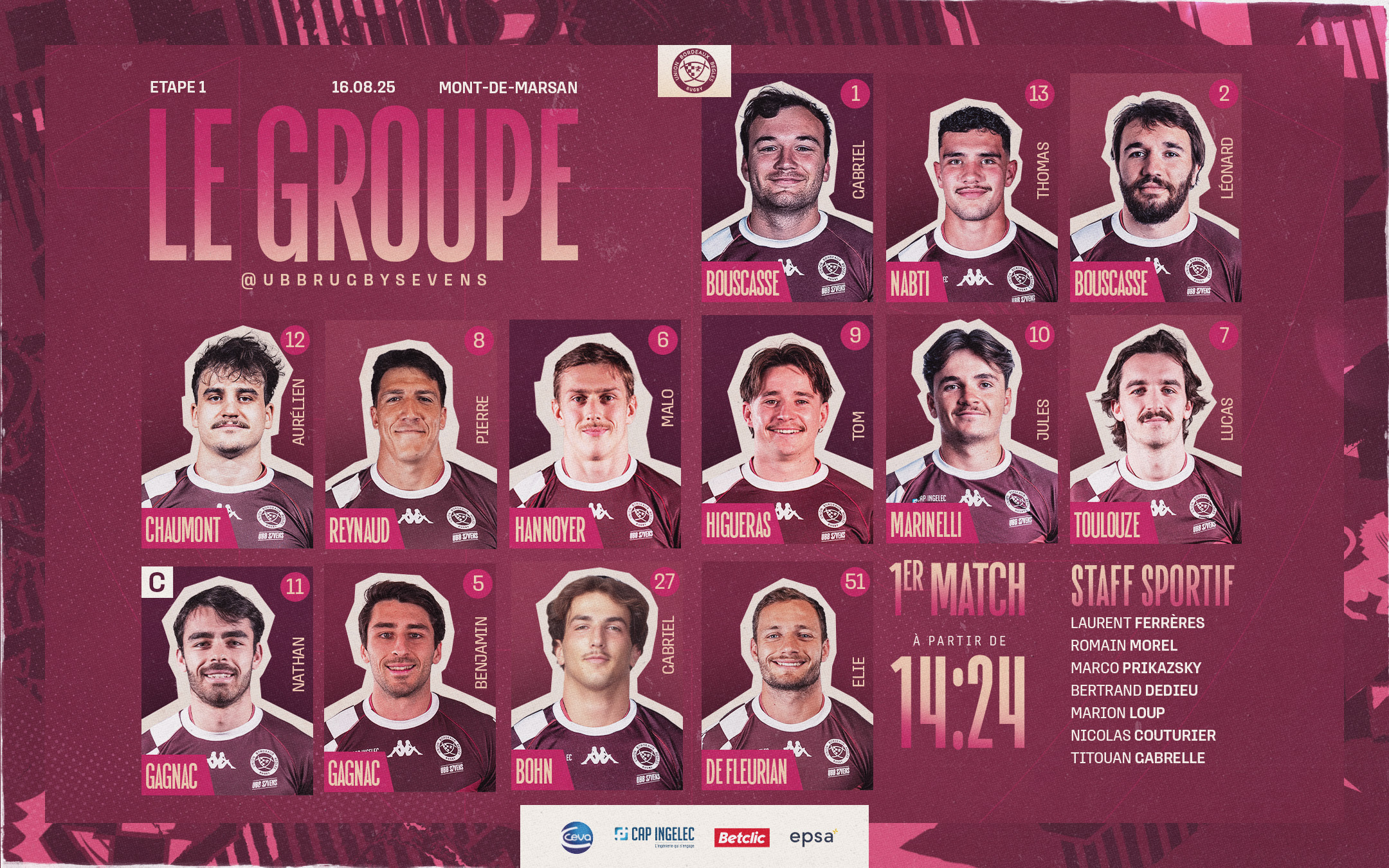 C’est parti ! La finale de la saison 2025-2026 se jouera ce samedi 7 février à partir de 14h24. Nos Bordelo-Béglais affronteront la Section Paloise en entame de cette nouvelle édition. Découvrez le groupe :