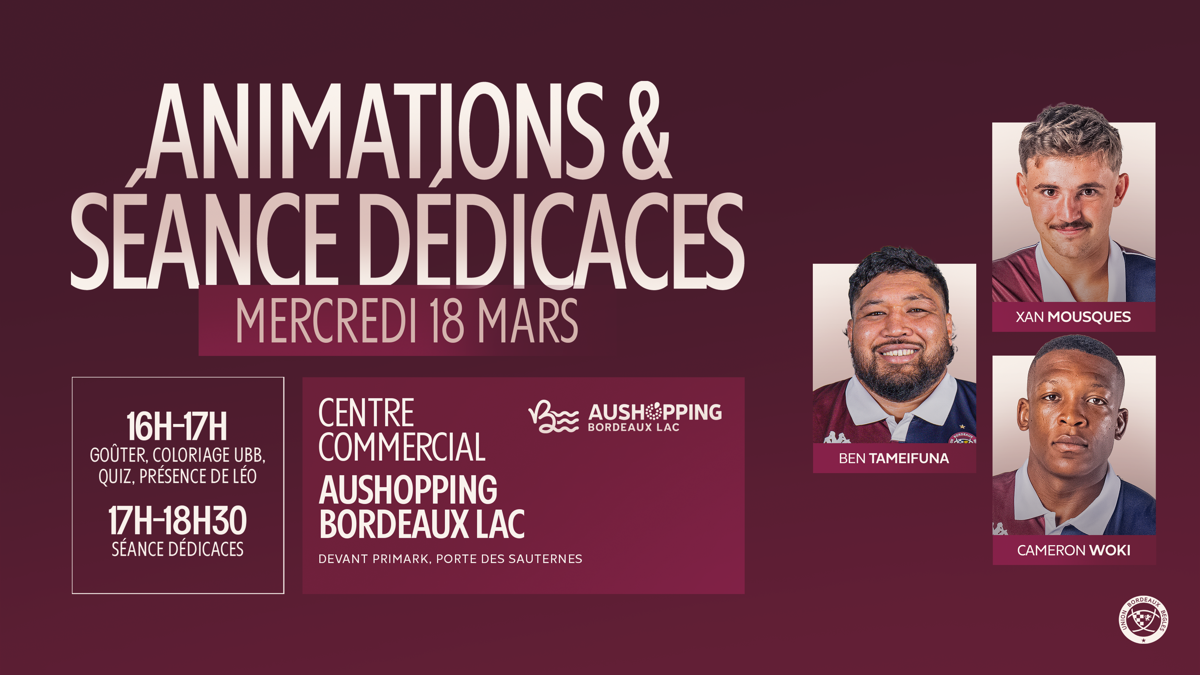 Le Centre Commercial Aushopping de Bordeaux Lac organise, en collaboration avec le club de l'UBB, une séance de dédicaces le mercredi 18 mars prochain en compagnie de Xan Mousques, Ben Tameifuna et Cameron Woki de 17h à 18h30.