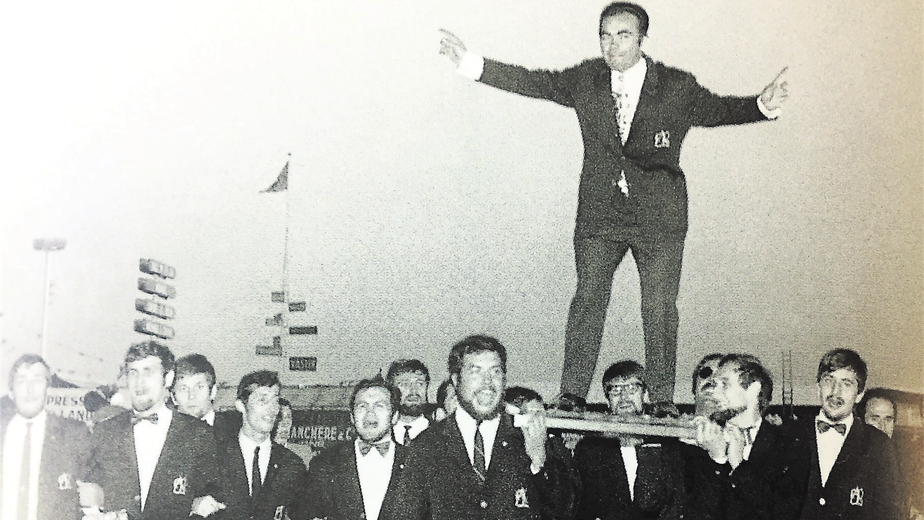 FRANÇOIS MORLAES PORTE JACKY JAMEAU EN TRIOMPHE SUR LE BRENNUS REMPORTÉ EN 1969, À L'ISSUE DE LA FINALE REMPORTÉE FACE AU STADE TOULOUSAIN AU STADE GERLAND À LYON (11-9).