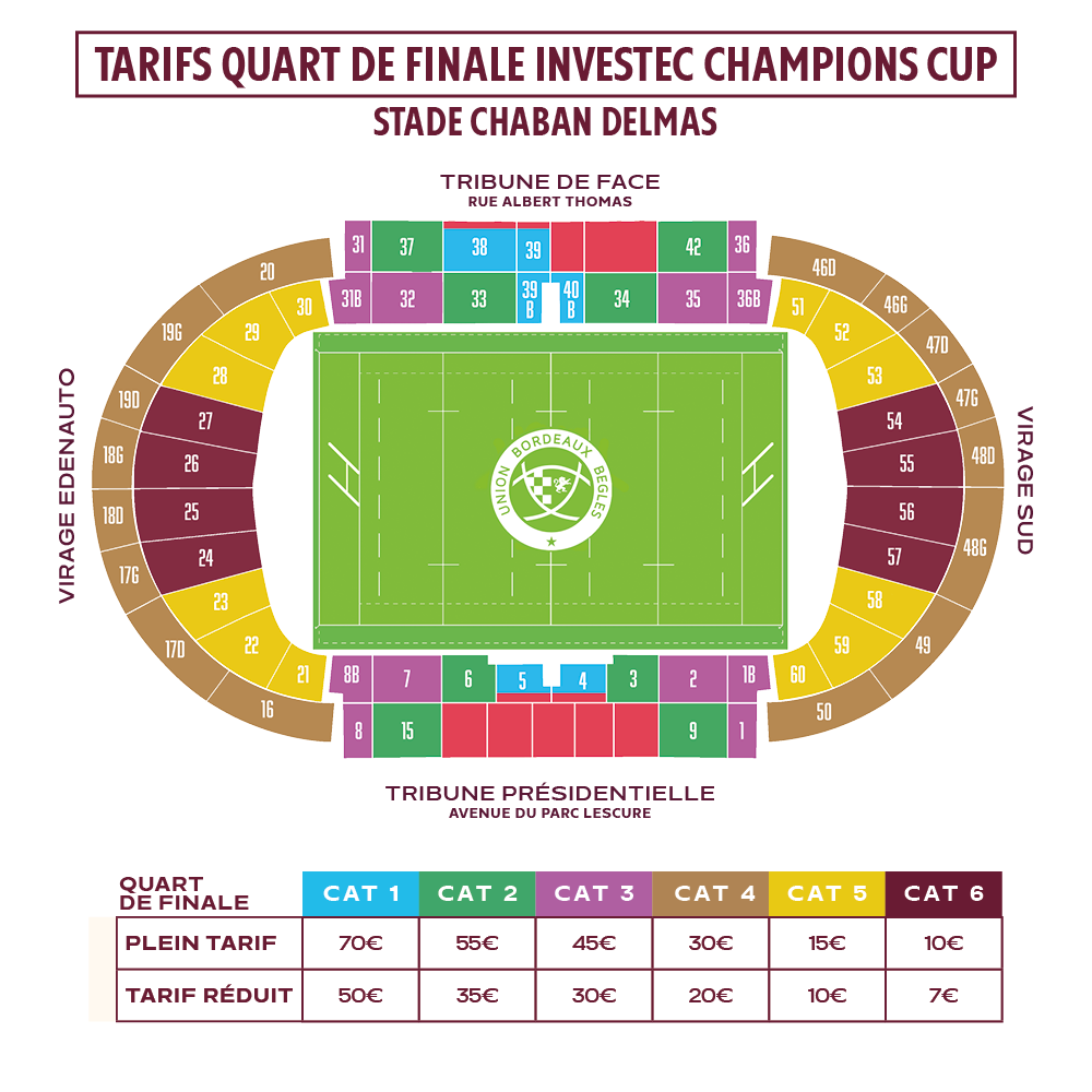 Pour cette rencontre, nous vous proposons des tarifs allant de 10€ en CAT 6 à 70€ en CAT 1 (voir ci-dessous).