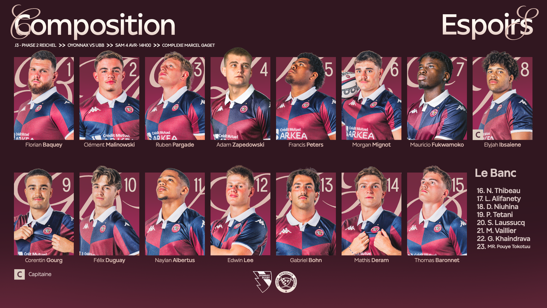 - Elyjah Ibsaiene revient avec les Espoirs au poste de numéro 8, et Mauricio Fukwamoko est positionné à l’aile gauche.