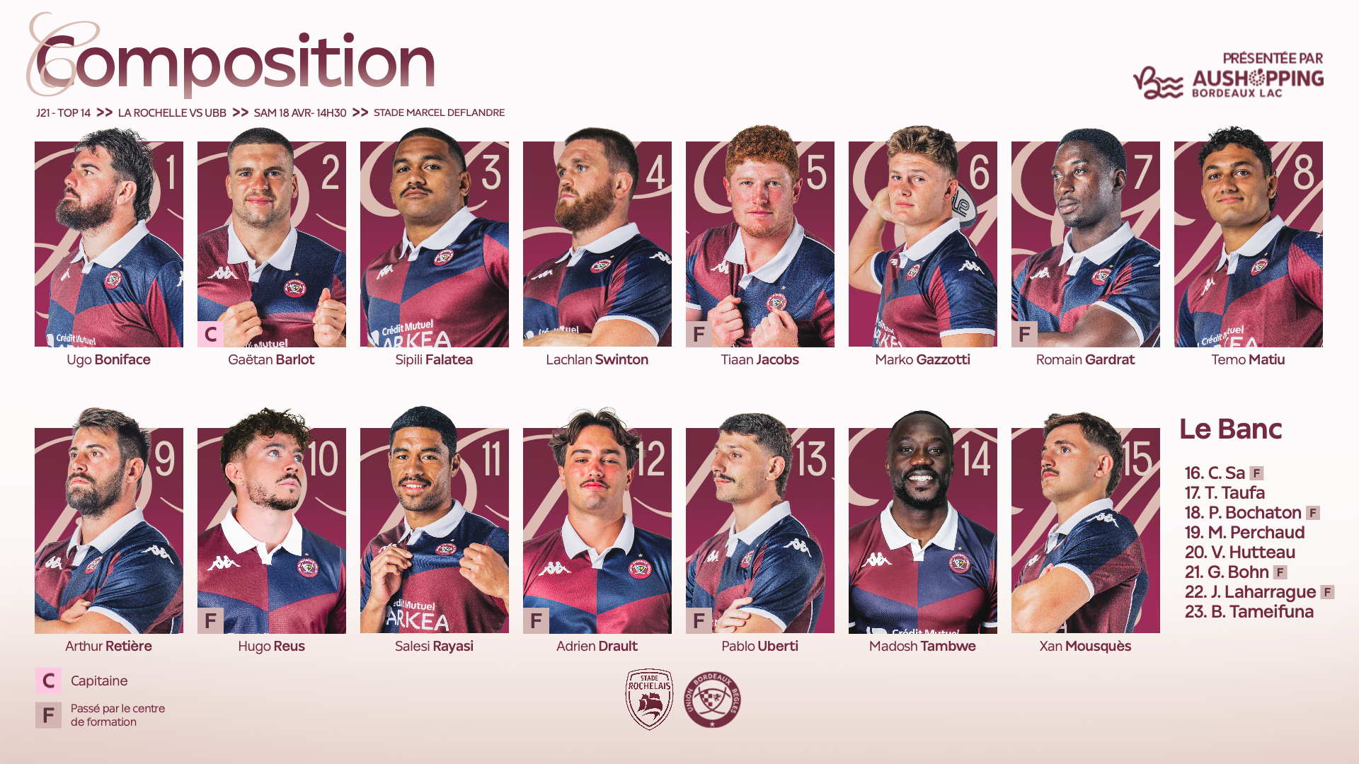 Second match à l'extérieur d'affilé pour nos girondins se week-end qui se déplaceront à La Rochelle pour le compte de la 21e journée de TOP 14. Découvrez la composition d'équipe pour ce choc face aux maritimes qui débutera à 14h30 ce samedi 18 avril :