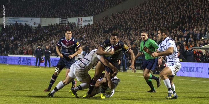Et pourtant, si la fête fut dans les tribunes, elle le fut moins sur le pré. Du moins pas de suite. Pris à la gorge par des brivistes motivés et morts de faim, les girondins éprouvèrent une certaine difficulté à mettre en place leur jeu de mouvement et de vitesse. Bien contrés et verrouillés par une grosse défense corrézienne, c'est aux buteurs que revinrent les premiers points, Germain répondant à Bernard, 03 - 06 (17'), dans une première moitié de mi-temps hachée par de nombreuses fautes de mains et des combats très disputés, notamment au sol. Devant tant d'engagement (plusieurs fois à la limite) de la part des deux camps, M.Berdos eu fort à faire dans ce premier acte, et finit par sortir le carton jaune contrer l'ancien girondin Mailei, coupable d'un plaquage cathédrale (24'). Montrant des intentions mais fautant plusieurs fois dans la finition ou la précision, la sanction finit par tomber pour l'UBB : sur un ballon mal négocié, l'ailier briviste Mafi s'empara du cuir pour aplatir après une course de 80m au pied des perches, permettant au CAB de creuser le trou, 03 - 13 (32'). Bousculés, les bordelo-béglais retrouvèrent enfin un peu de leur jeu et répliquèrent de justesse avant la mi-temps par un essai en puissance de Marais sur la sirène pour sauver les meubles, 10 - 13 (40').