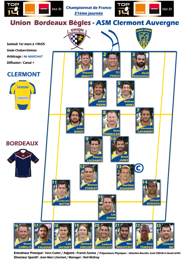Voici la composition de l'équipe de l'UBB qui accueillera samedi à 14h55 les galactiques clermontois dans un stade Chaban Delmas rempli de plus de 31 000 supporters !