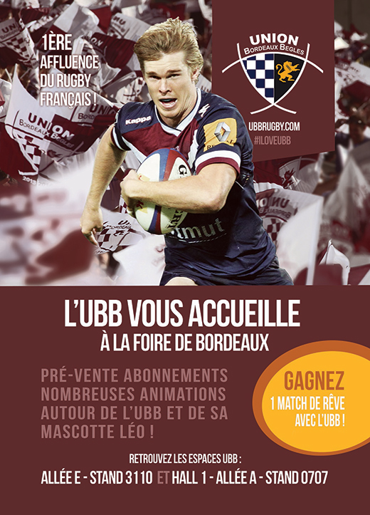 L'Union Bordeaux Bègles est présente sur la Foire de Bordeaux du samedi 24 mai au dimanche 1er juin de 10h à 20h sans interruption, au Parc des Expositions de Bordeaux Lac. Deux nocturnes sont prévues le samedi 24 et le mercredi 28 mai jusqu'à 22h30.