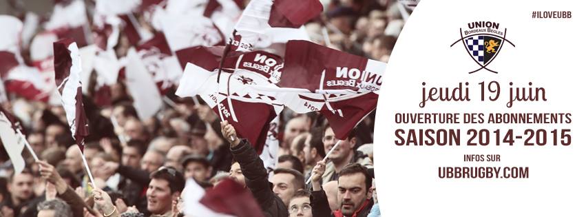 Vous pouvez vous abonner à l'UBB pour la saison 2014 - 2015 à partir du jeudi 19 juin sur notre billetterie en ligne à partir de 11h00, aux guichets du Stade Chaban Delmas place Johnston à partir de 10h00 ou au Haillan chez les Girondins de Bordeaux.
