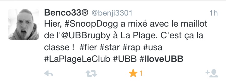 Le tweet de l'UBB ajouté en favori par le compte du chanteur :