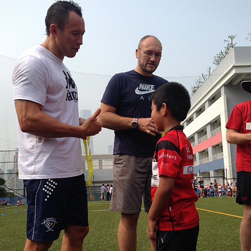 Pour clôturer le séjour, la délégation UBB se rend à King’s Park où 1 200 enfants sont rassemblés pour un tournoi de rugby. Bruce Reihana et Olivier Brouzet remettent les médailles aux vainqueurs et signent des autographes aux jeunes hongkongais ravis...