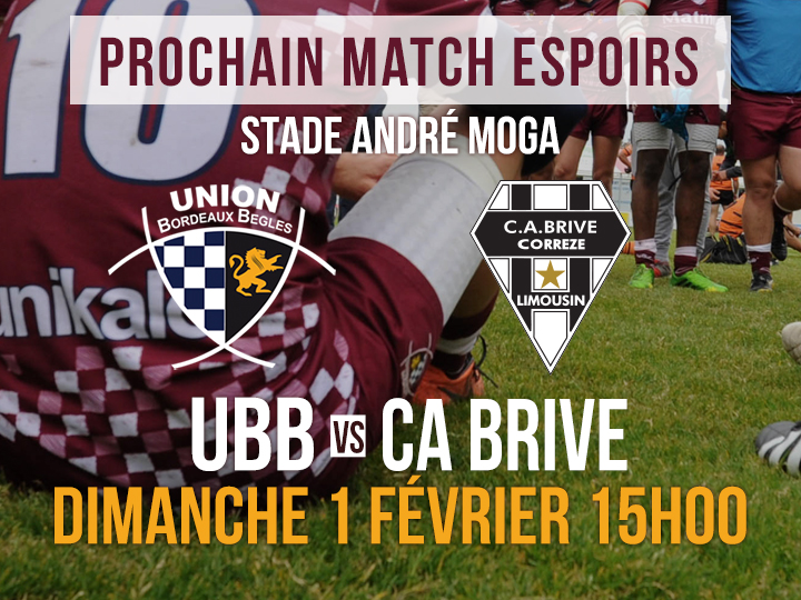 Nos Espoirs reçoivent Brive ce dimanche 1er Février à 15h00 au stade André Moga. Au classement, le CAB est 8ème, juste derrière nous, ce match est donc capital pour la suite du championnat ! Nos jeunes pousses comptent sur vous pour les encourager !