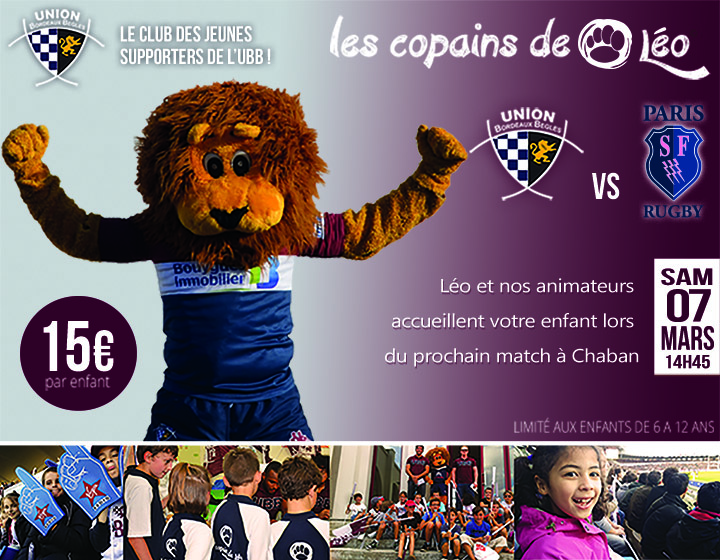 Après cette belle après-midi ensoleillée à Chaban samedi et la belle victoire contre le fameux RC Toulon, les inscriptions pour "Les Copains de Léo" pour UBB-Stade Français le samedi 07 Mars prochain à 14h45 sont ouvertes ! Ne tardez plus pour inscrire votre enfant !