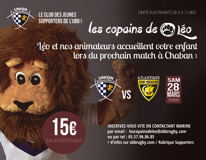 Les inscriptions pour "Les Copains de Léo" pour UBB-Atlantique Stade Rochelais, le samedi 28 Mars prochain à 15h00 sont ouvertes ! Ne tardez plus pour inscrire votre enfant !