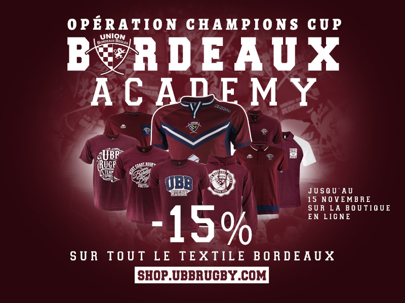 Foncez sur notre boutique en ligne pour profiter de notre offre "Bordeaux Academy" : -15% sur tout le textile Bordeaux, valable sur la boutique en ligne officielle uniquement.