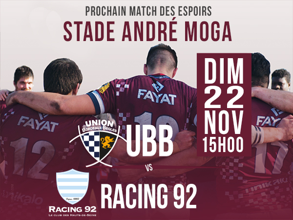 Supporters de l'UBB, les joueurs auront besoin de votre soutien dimanche 22 Novembre à 15h à Bègles pour la réception du Racing 92 !