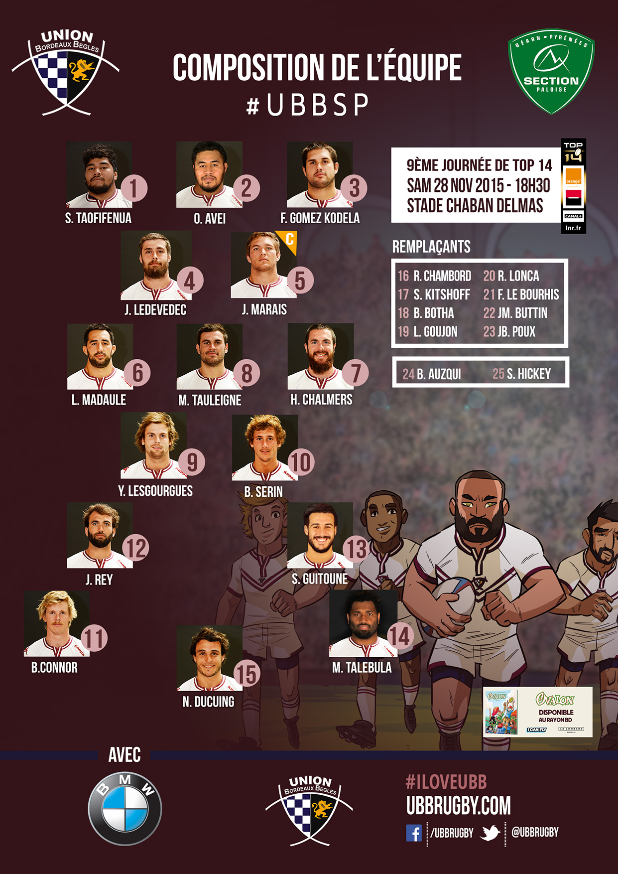 Demain samedi à 18h30, l'UBB vous donne rendez-vous à Chaban après presque un mois sans match à domicile, pour la réception de la Section Paloise ! Le stade vous ouvre ses porte dès 16h30, pensez donc à venir un peu plus tôt au stade pour anticiper le renforcement de la sécurité mis en place. Que la fête soit belle et allez l'UBB !