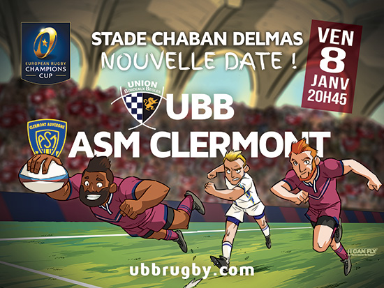 La rencontre UBB - ASM Clermont, 1er round de la Champions Cup initialement prévu le 15 novembre mais reporté suite aux événements dramatiques parisiens, est programmée au 8 janvier 2015 à 20h45 au stade Chaban Delmas.