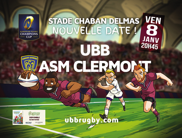 Chers supporters, comme vous le savez le match de Champions Cup opposant l'UBB à l'ASM Clermont Auvergne qui devait avoir lieu initialement le dimanche 15 novembre 2015 a été reporté au vendredi 8 janvier 2016 à 20h45.