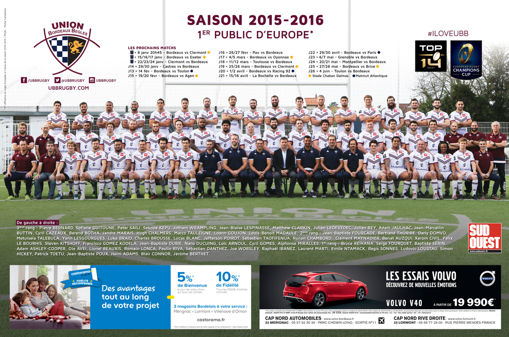 Aujourd'hui pour tout achat du journal Sud Ouest en Gironde, le poster de la saison 2015/2016 vous est offert. Un journal et poster gratuitement envoyés aujourd'hui à tous les abonnés et partenaires de l'UBB !