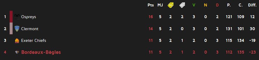 Enfin pour l’UBB, il faut aller s’imposer avec le point de bonus offensif à Clermont. Dans le même temps, il faut espérer que ni Exeter ni les Ospreys ne prennent un seul point de bonus...
