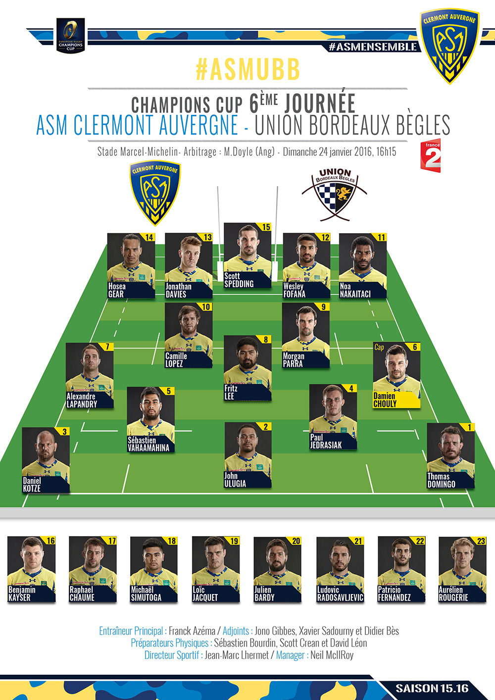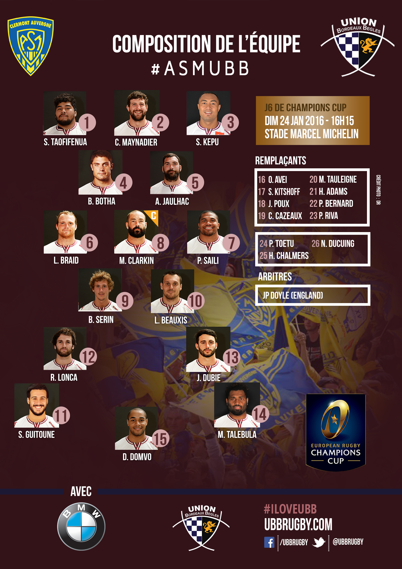 C'est au stade Michelin, dimanche 24 janvier à 16h15, que l'Union Bordeaux Bègles jouera sans doute son dernier match de Champions Cup cette saison. Malgré un carton plein à domicile face aux clubs britanniques (victoire bonifiée face à Exeter, victoire face aux Ospreys), les chances de franchir les phases de poule ont clairement fondu avec la défaite girondine face aux Clermontois le 8 janvier dernier lors du match aller à Chaban Delmas.