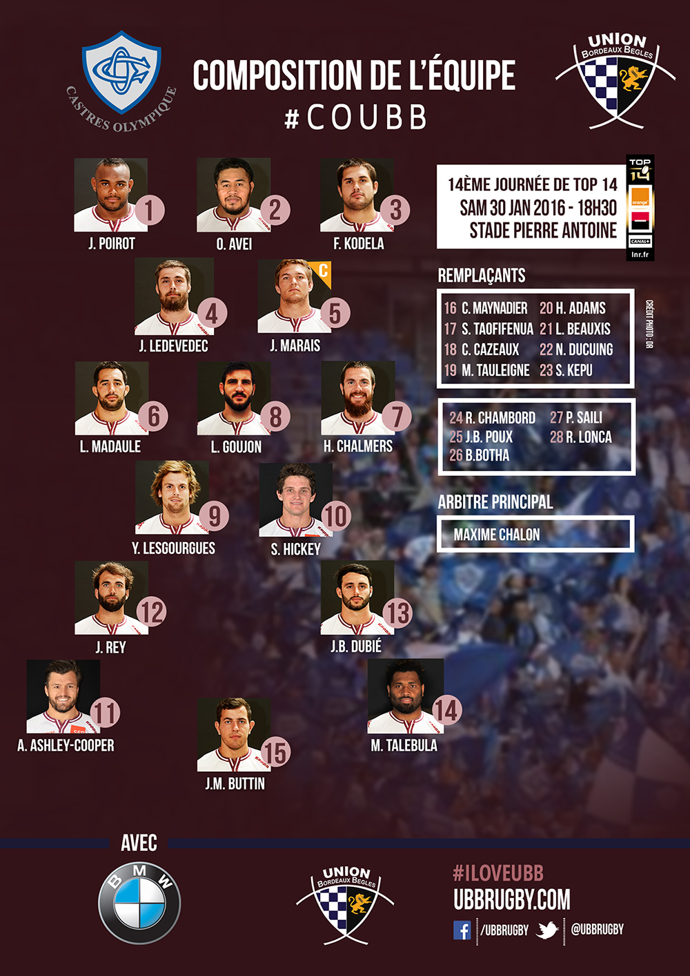 Retour au Top 14 après beaucoup d'émotions en Champions Cup ! Pour la 14ème journée, l'UBB affrontera le Castres Olympique au stade Pierre Antoine, demain samedi à 18h30.