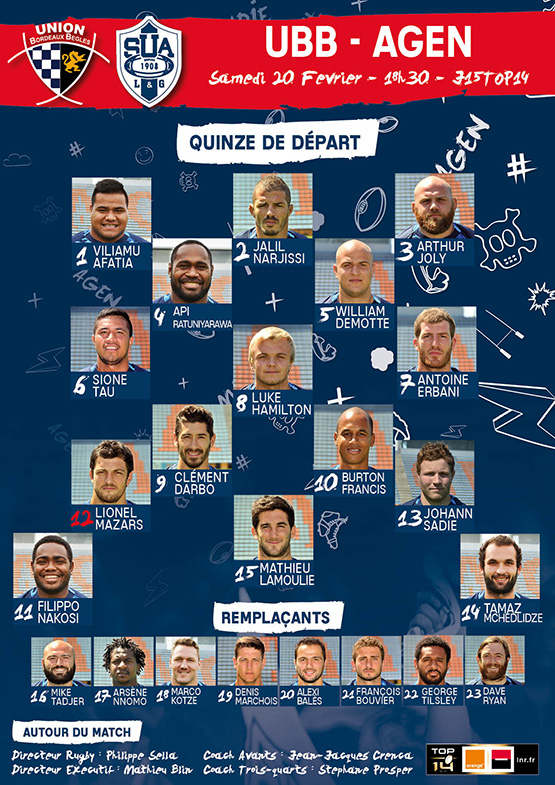 Demain samedi 20 février à 18h30, l'UBB retrouvera le stade Chaban Delmas pour la réception du SU Agen dans le cadre de la 15ème journée du championnat de Top 14. Avec un match en avance (outre le RCT, les autres clubs joueront la 13ème journée le week-end du 19 mars), nos joueurs sont de retour dans le haut du classement et se doivent de confirmer leur victoire dimanche dernier face à Toulon au Matmut Atlantique. De son côté, Agen n'a plus gagné depuis la 7ème journée (victoire à domicile 28-23 face au Stade Français à Armandie) et débarque à Chaban avec une seule idée en tête : lancer son opération maintien en s'imposant sur la pelouse girondine.