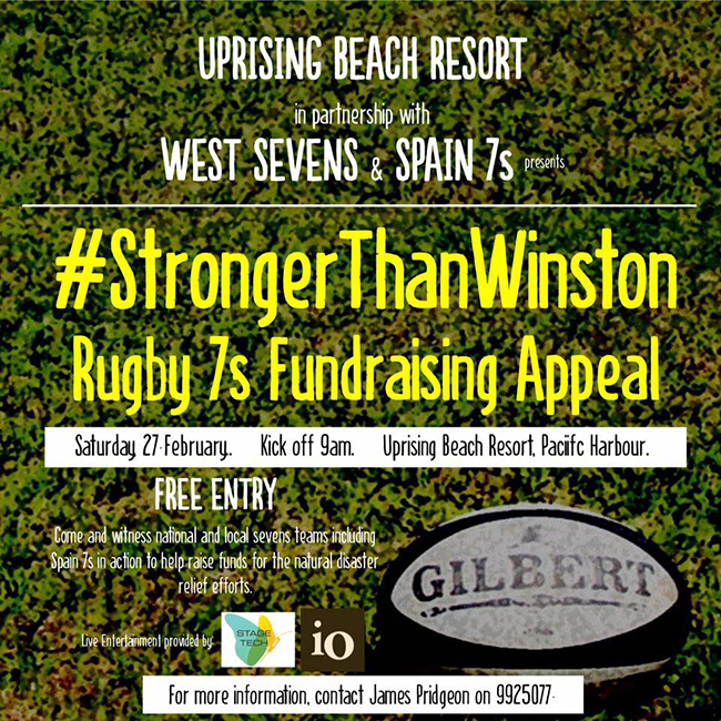 Afin d’aider les Fidjiens à reconstruire leur pays, un tournoi de rugby à 7 sera organisé samedi 27 février dans le sud des Fidji (partie de l’île ou il y a eu moins de dégâts). Cet évènement organisé en collaboration avec la Croix Rouge réunira toutes les plus grandes équipes de rugby à 7 du pays et permettra de récolter des dons pour aider à la reconstruction.