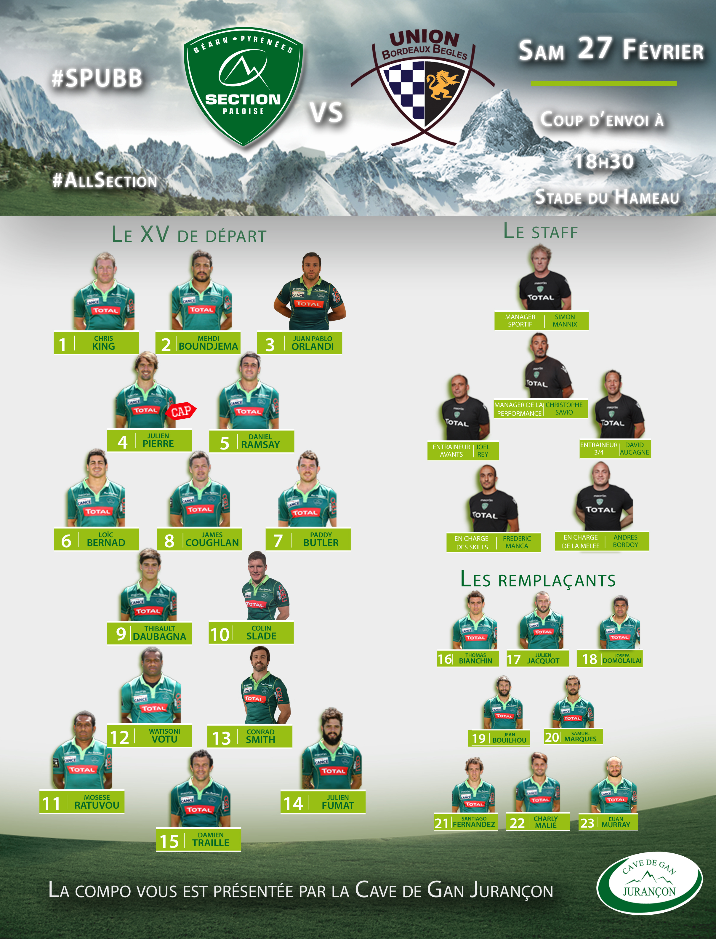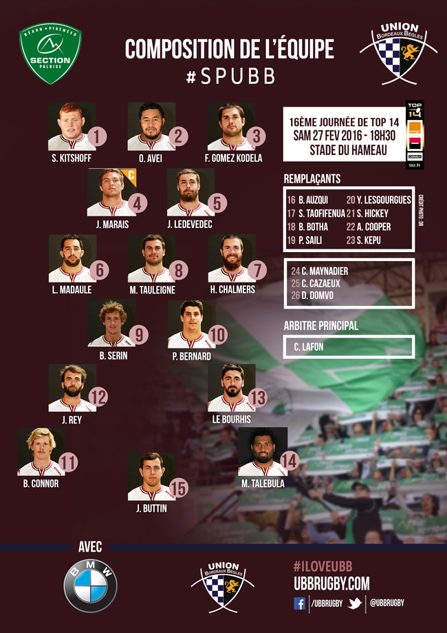 Demain, samedi 27 février à 18h30, l'UBB se déplace à Pau pour y affronter la Section Paloise dans son antre du Hameau. Cette rencontre va se dérouler dans le cadre de la 16ème journée du championnat de France de Top 14. Après une victoire poussive à domicile face à la lanterne rouge Agen (24-19), l'UBB aura à coeur de s'imposer en terre béarnaise pour se rapprocher un peu plus des phases finales. De son côté, la Section Paloise vient de signer sa 1ère victoire à l'extérieur à Montpellier grâce à une prestation majuscule de son ouvreur néo-zélandais Colin Slade (19-16). Pau ne s'est inclinée qu'une seule fois cette saison sur sa pelouse en Top 14 (défaite 13-18 contre Brive) et les hommes de Simon Mannix comptent bien enchaîner les résultats pour s'éloigner un peu plus de la zone de relégation.