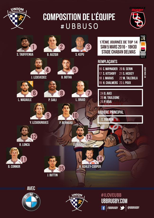 Raphaël Ibanez et son staff continuent de faire tourner et de donner leur chance à tous les joueurs. Seul Pierre Bernard, Félix Le Bourhis, Julien Ledevedec, Louis-Benoît Madaule, Blair Connor, et Jean-Marcellin Buttin restent titulaires par rapport au déplacement à Pau. Avec la blessure de Julien Rey, Romain Lonca fait son retour au centre. Benat Auzqui fait également son retour au poste de talonneur, tout comme Peter Saili qui profite de la mise au repos de Loann Goujon sélectionné avec les bleus. Notre jeune international Jefferson Poirot est lui aussi mis au repos par le staff et il sera suppléé par Sébastien Taofifénua. Enfin nos 2 Asutraliens Adam Ashley-Cooper et Sekope Kepu retrouvent eux aussi une place de titulaire respectivement à l'aile et en pilier.