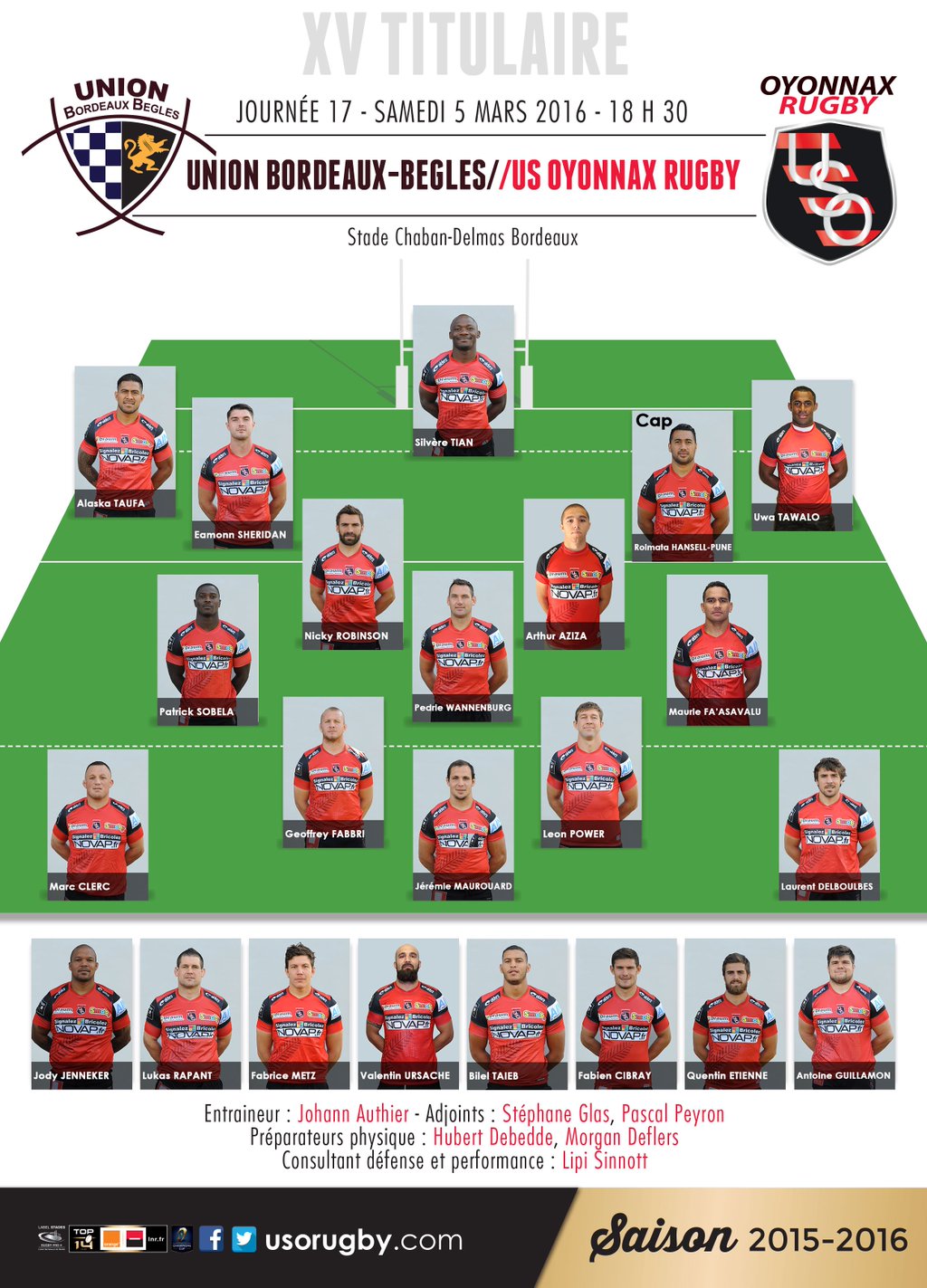 Demain samedi à 18h30, l'UBB recevra Oyonnax au stade Chaban Delmas. Cette rencontre se déroule dans le cadre de la 17ème journée de Top 14. L'UBB, qui compte toujours un match d'avance, pointe actuellement à la 4ème place du classement et reste en course pour une première qualification historique pour les phases finales. De leur côté les Oyonnaxiens, devenus dernier du classement après la victoire de Agen le week-end dernier contre La Rochelle, luttent pour leur survie dans l'élite du rugby français. Bien que victorieux de leurs trois derniers matchs, les hommes de Raphaël Ibanez sont offensivement moins prolifiques que lors des saisons précédentes. Dire que ce match sent le piège serait manquer de respect vis à vis du barragiste de la saison 2014-2015 : chaque équipe de Top 14 est capable de se sublimer et de prendre les meilleurs bookmakers à contre-pied. Le vainqueur demain sera l'équipe la plus combative, nos joueurs sont avertis...
