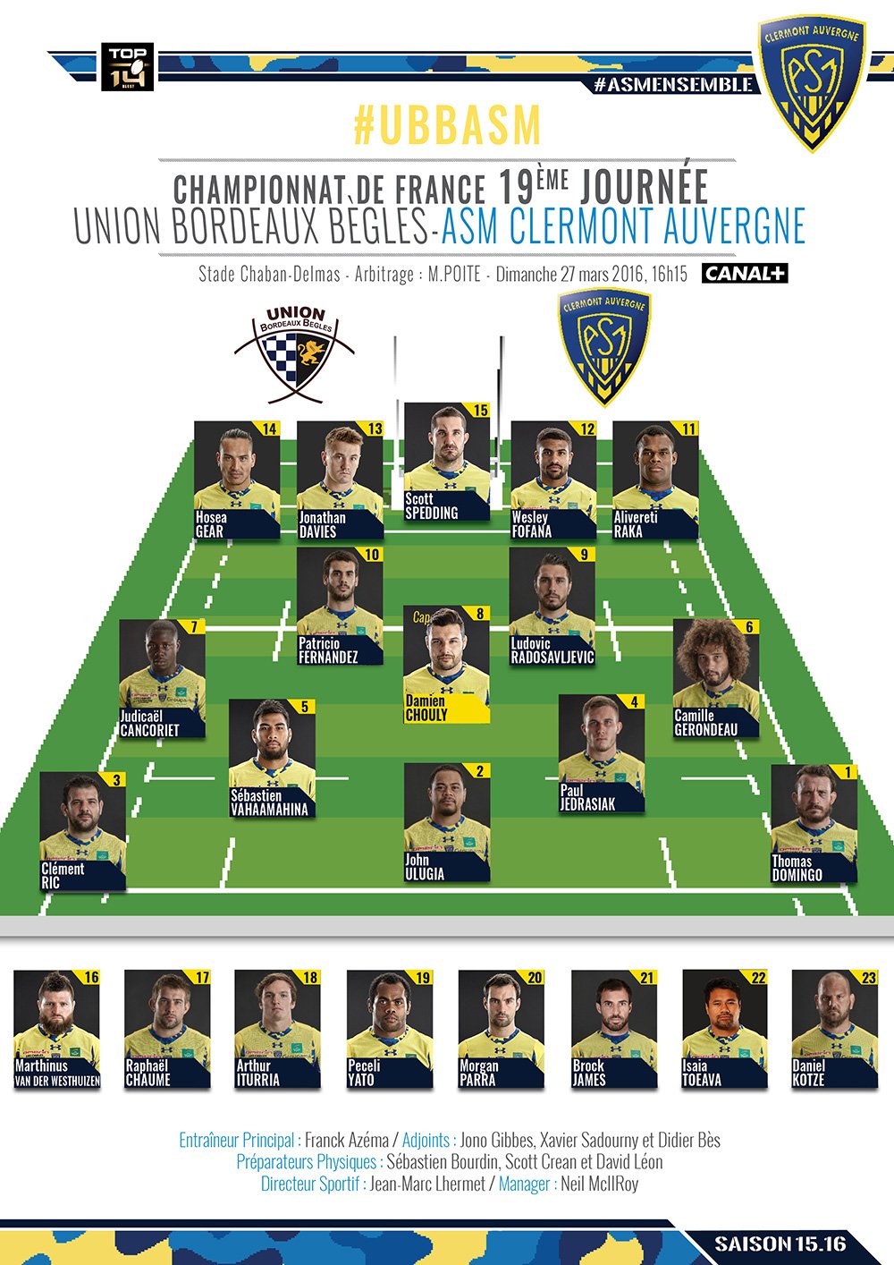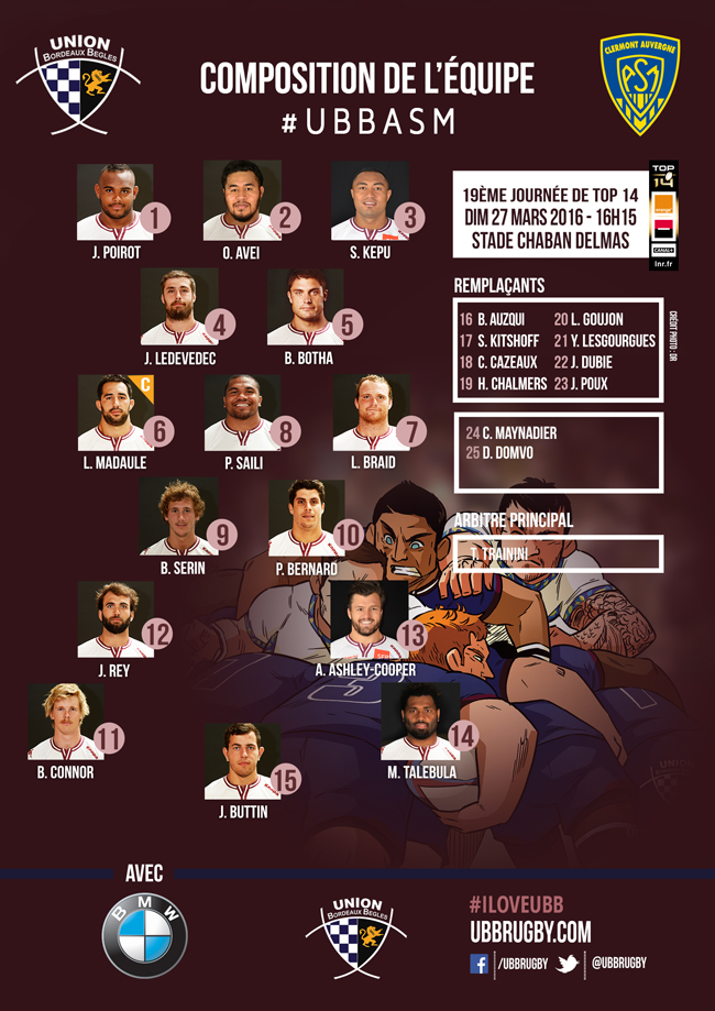 Ce dimanche à 16h15, l'UBB acueille l'ASM Clermont Auvergne pour le compte de la 19ème journée de Top 14. L'UBB, 5ème du Top 14 se retrouve ce soir aux pieds d'une montagne, avec la réception à six jours d'intervalle des deux leaders du championnat, Clermont et le Racing 92. De ces deux rencontres à domicile, les joueurs de Raphaël Ibanez se doivent d'empocher le maximum de points pour poursuivre leurs quête vers les phases finales.