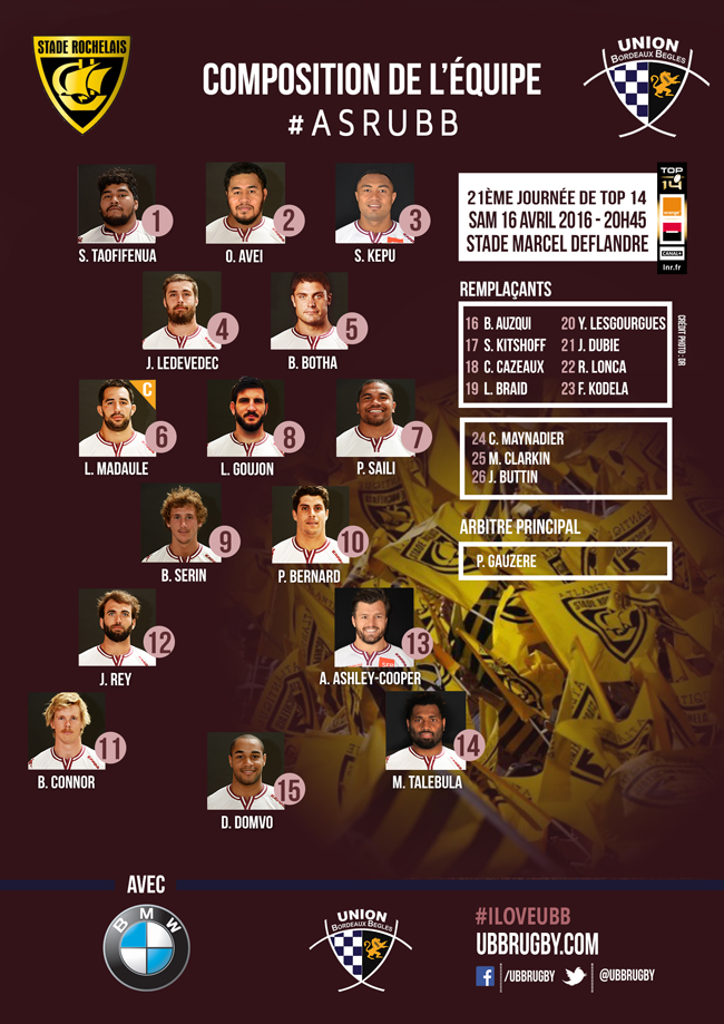 Ce samedi à 20h45 l'UBB, 5ème du Top 14, se déplace au stade Marcel Deflandre pour y affronter le Stade Rochelais dans le cadre de la 21ème journée de Top 14.