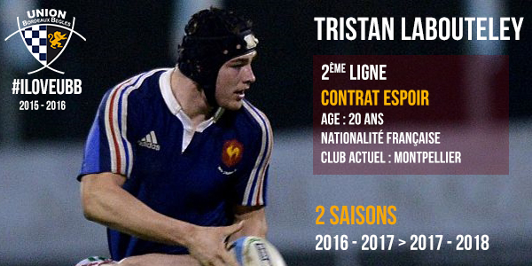 Le jeune 2ème ligne français Tristan Labouteley vient de s'engager avec l'Union Bordeaux Bègles. Il arrive en provenance de Montpellier, et a paraphé un contrat de 2 ans. Il a notamment participé au tournoi des 6 Nations et à la Coupe du Monde -20 ans lors de la saison 2014-2015.
