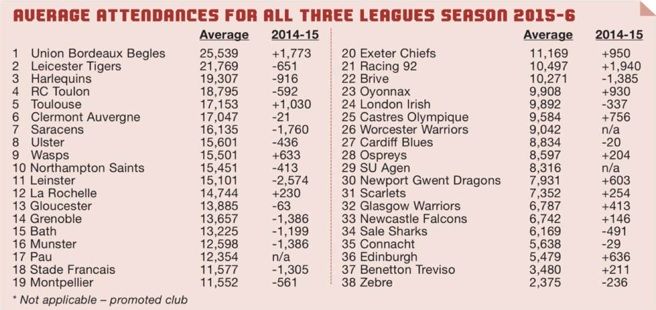 En diffusant les affluences du rugby par club dans les 3 championnats d'élite européens, le journal anglais The Rugby Paper a révélé que l'Union Bordeaux Bègles avait attiré pour la deuxième année consécutive le plus grand nombre de supporters au stade. L'écart avec le deuxième, les Leicester Tigers, s'est même accentué puisque le club anglais a connu une légère baisse alors que l'UBB enregistre avec +6,5 % (25 539 spectateurs en moyenne) la deuxième plus forte progression derrière le Racing 92 (+ 15,6 % avec 10 497 spectateurs).