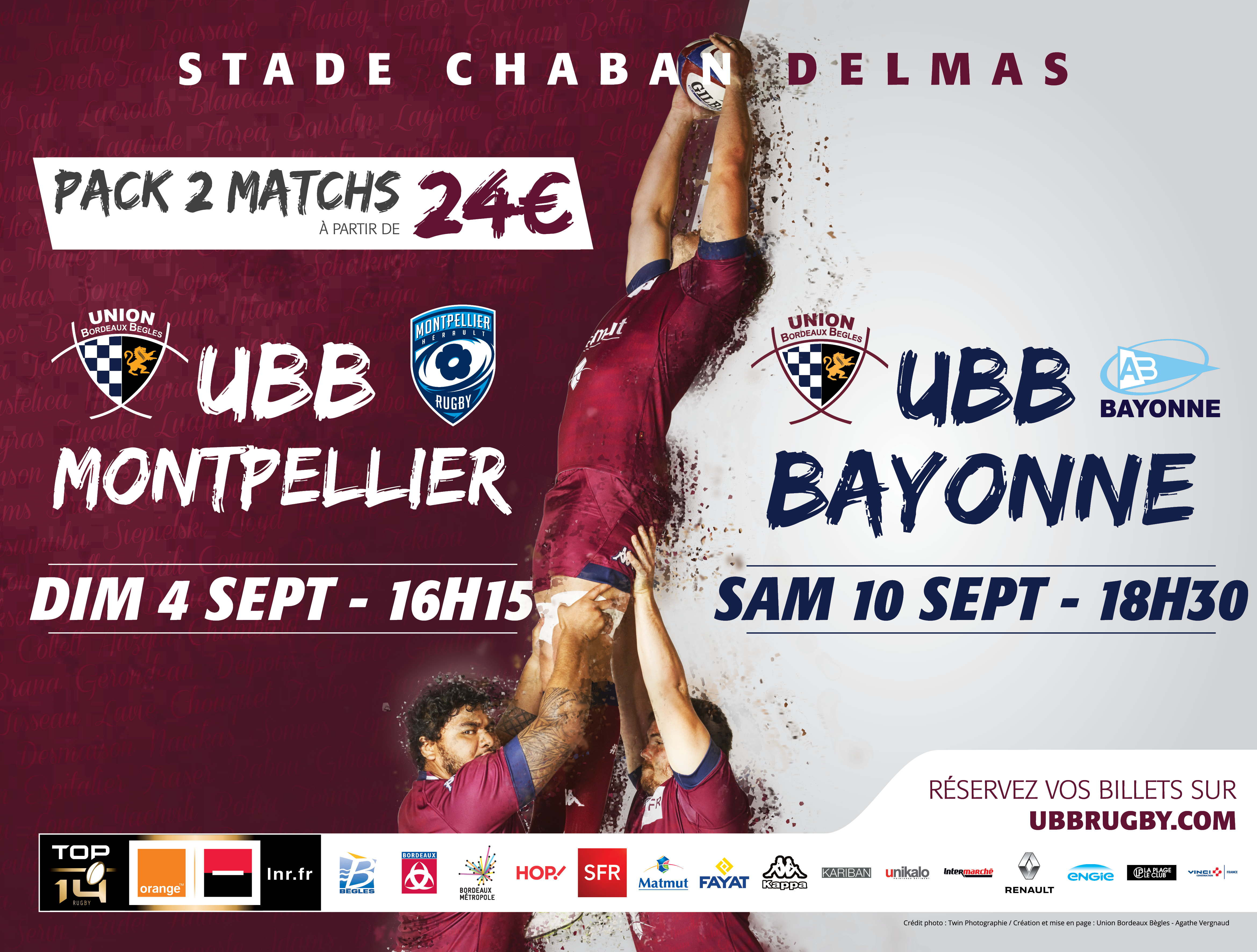 Avant ce match, l'UBB recevra dimanche 4 septembre le XV héraultais et son pack surpuissant. Pensez à réserver aujourd'hui votre pack pour assister à ces deux grands rendez-vous, à partir de 24 € (12 € en tarif réduit)...