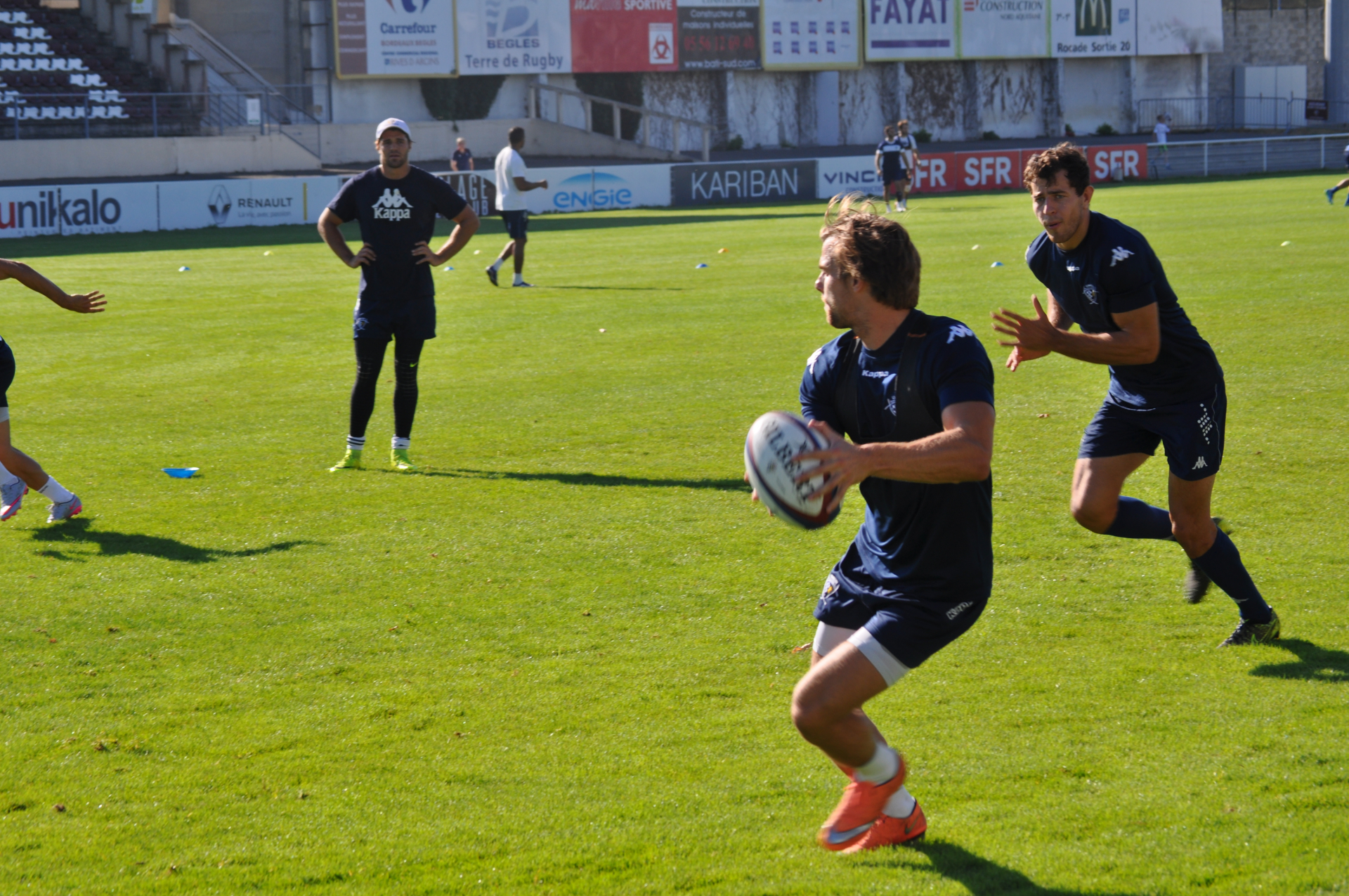Aujourd'hui, entraînements spécifiques pour les avants et les trois quarts de l'équipe. Tandis que le groupe arrières s'exerçait sur des exercices de un contre un, les avants eux travaillaient les secteurs de la conquête sous les ordres de Jacques Brunel, notamment la touche et la mêlée. Nos avants devront se montrer à la hauteur pour espérer remporter son combat face à la puissance des avants héraultais, dans la chaleur de Chaban Delmas ce dimanche.