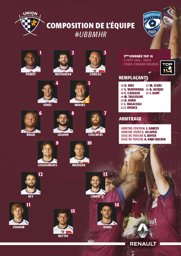 Le staff de Raphaël Ibanez vient de dévoiler la composition de l'UBB qui affrontera demain sa bête noire (6 défaites en 8 matchs), Montpellier Hérault Rugby. Nos Girondins auront fort à faire demain, dans la chaleur de leur jardin de Chaban Delmas (coup d'envoi à 16h15), pour contenir les assauts du pack le plus puissant du Top 14...