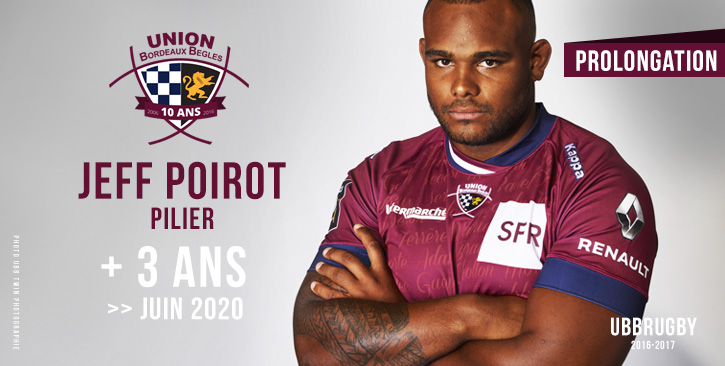 Jefferson Poirot était engagé à l'UBB jusqu'en juin 2017, il a renouvelé son contrat jusqu'à la fin de la saison 2019-2020. Agé de 23 ans seulement (il en aura 24 le 1er novembre), Jeff totalise 90 matchs sous le maillot girondin, en Top 14 et en Coupe d'Europe. Il a porté pour la première fois les couleurs de l'Equipe de France en février 2016 lors du Tournoi des 6 Nations, et cumule aujourd'hui 7 sélections dont 6 titularisations après une belle tournée en Argentine en juin dernier.
