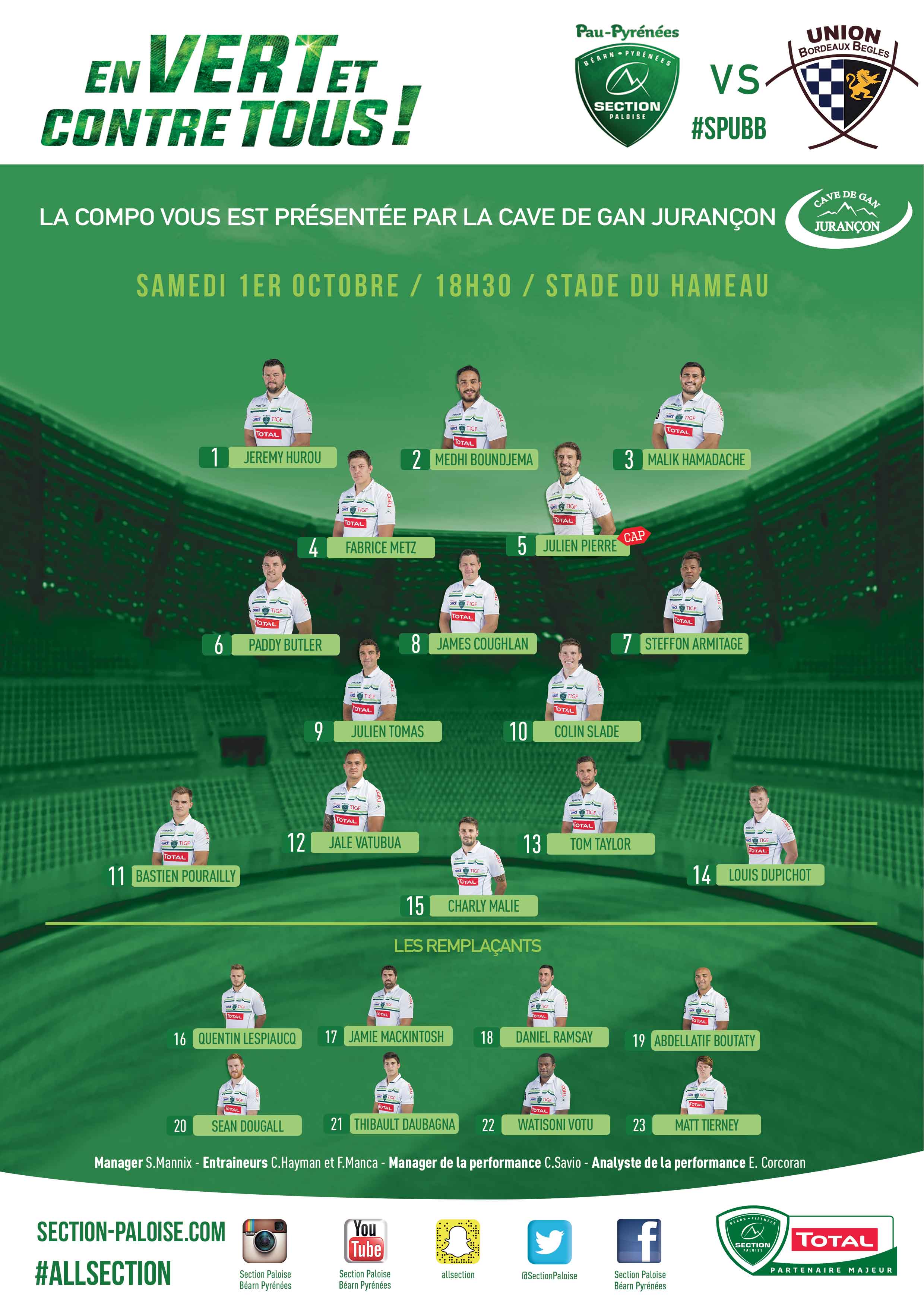 A l'occasion de la 7ème journée du Top 14, l'UBB se déplace en terre béarnaise demain samedi à 18h30. Galvanisés par leur victoire à Grenoble le week-end dernier, les hommes en vert de Simon Mannix se sont promis de ne pas tomber dans le même piège que la saison passée, où les Girondins s'étaient imposés au stade du Hameau...