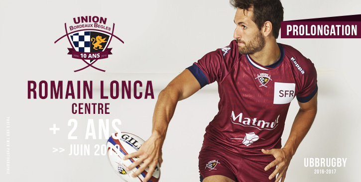 Notre centre polyvalent Romain Lonca a prolongé de deux ans son contrat à l'Union Bordeaux Bègles (jusqu'en juin 2019). Arrivé d'Hendaye en 2013 -diplôme d'ostéopathe en poche-, Romain totalise aujourd'hui 49 matchs sous le maillot girondin. Il a notamment marqué l'essai de la victoire à Pau samedi dernier sur un superbe contre à la 76ème minute de jeu alors que, remplaçant, il venait d'entrer en jeu.