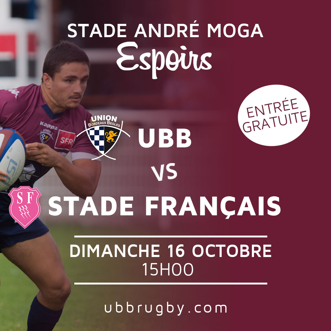 Notez bien le prochain match à domicile des Espoirs de l'UBB, dimanche 16 octobre à 15h au stade André Moga face au Stade Français. Venez nombreux les encourager, l'entrée est gratuite !