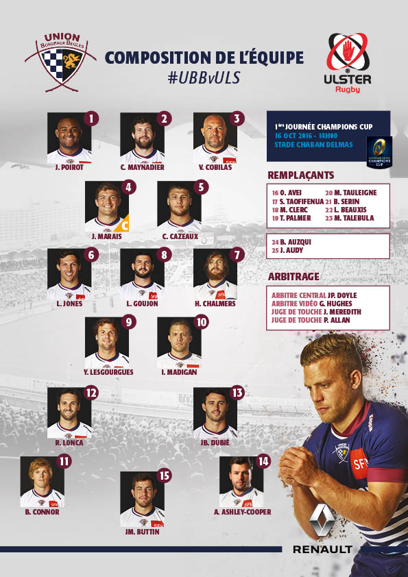 C'est reparti ! Dimanche, la Champions Cup fera son retour à Chaban. Pour cette première journée l'UBB accueille les Irlandais de l'Ulster Rugby. C'est un véritable choc qui attend nos joueurs face à l'actuel leader du championnat celte. Après trois victoires consécutives en Top 14, nos joueurs auront à coeur de bien démarrer cette nouvelle campagne européenne, malgré une infirmerie bien remplie qui a poussé le staff de Raphaël Ibanez à des aménagements inédits, à l'instar de Luke Jones en 3ème ligne.